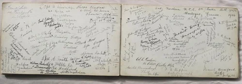 The second book - the Grey Book - has entries from the NCC at Calais. There are poems, sketches, cartoons and quotes - all signed with name and address.