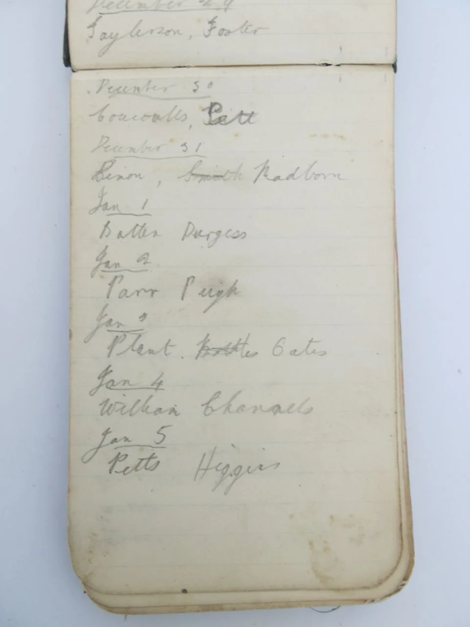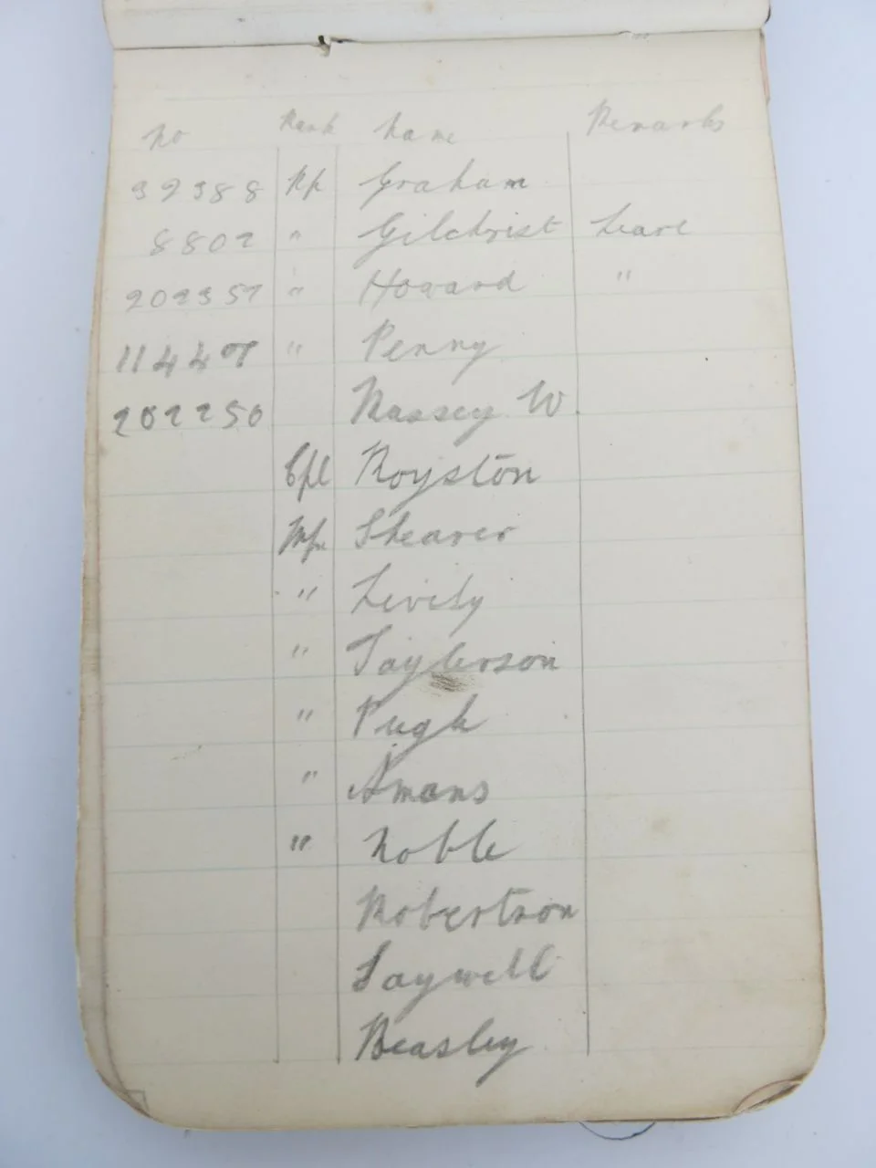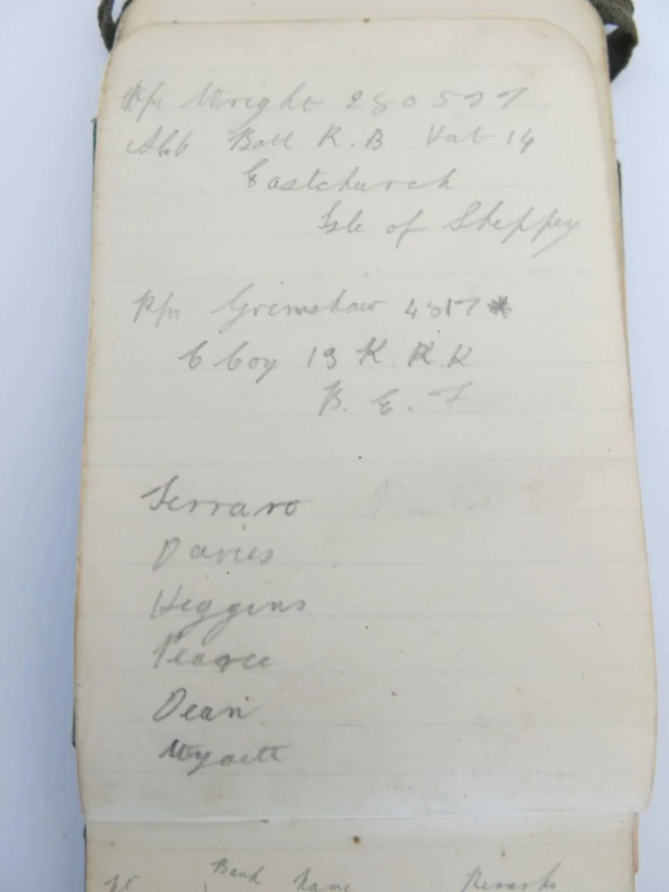 These addresses are transcribed from the opening pages of the book. They appear to date from his time at the American military hospital in 1916 when he was being treated for a gunshot wound to his arm. At some stage he is transferred back to the Depot Rifle Brigade with a role in the field ambulance.