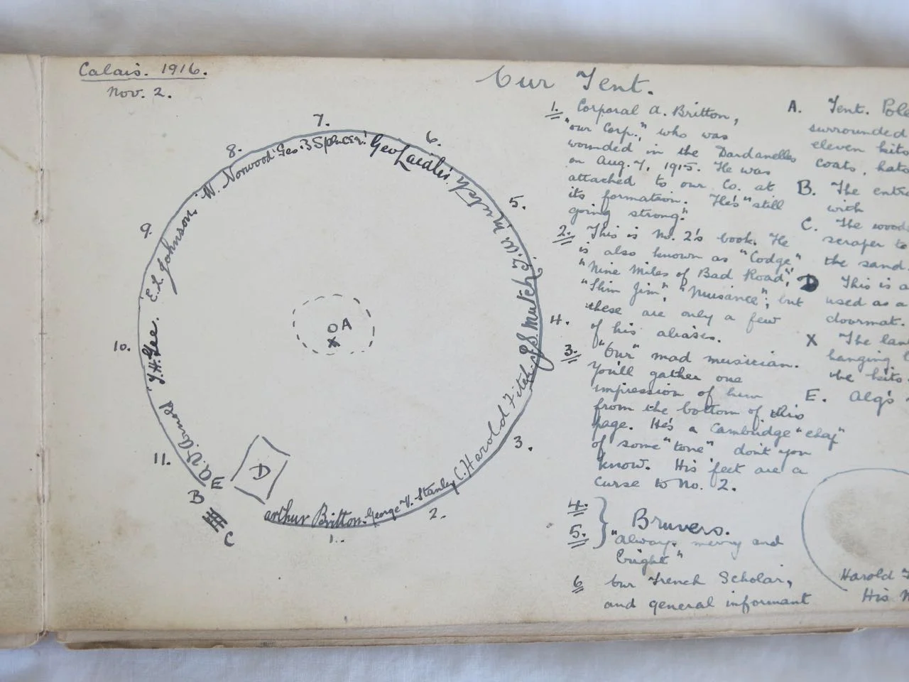 This is part way through George Stanley's red book for the 2nd Northern Company. It shows a circle of friendship for the group of Non Combatants (NCC) who shared a tent at Calais in November 1916. Most were conscientious objectors who signed up to serve overseas as non combatants.